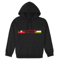 Black Palestinian solidarity hoodie with 'Land Back' design.